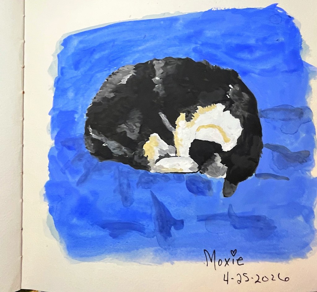 Not crazy about the blue blanket. It was ok then I tried to get the folds in. It’s my first try though (gouache), next I’ll do Moxie with her sister Olive. 😊
